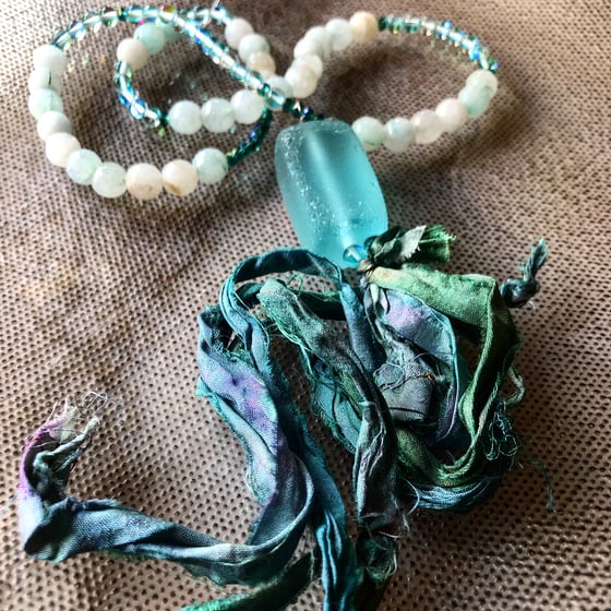 Water Healing/Aquamarine and Hand Dyed Silk Necklace and Earring Set